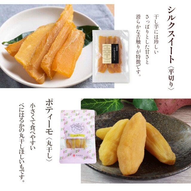 ●定番人気のべにはるか(平切り・角切り)とシルクスイート、直営店で人気のポティーモ(べにはるか丸干し)をセットにした、気軽に渡せるカジュアルギフトです。