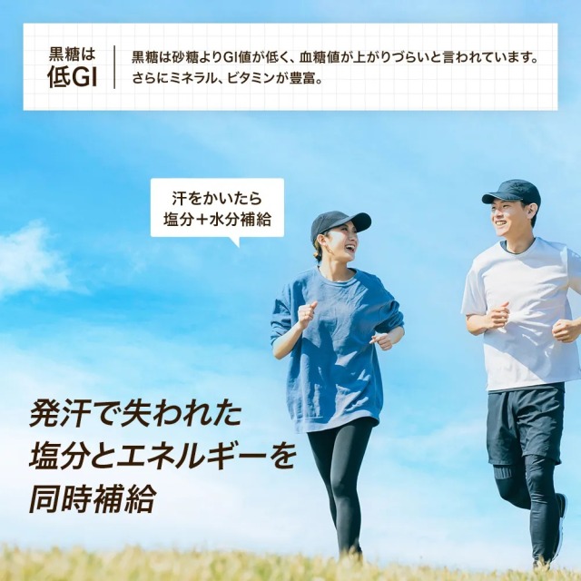 汗で失われがちな塩分、糖分、ミネラルを同時にバランスよく補給できます。また、砂糖に比べてGI値が比較的低く、血糖値が上がりづらいと言われています。